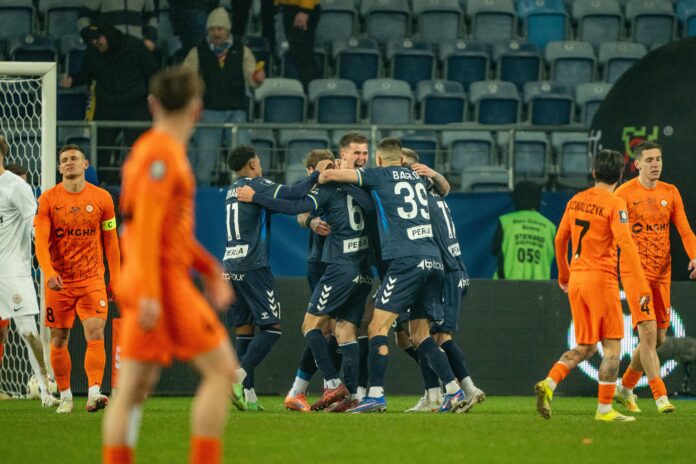 Sędzia Damian Kos nie gwizdał każdego kontaktu, a czasem aż prosiło się, aby zaczął temperować zachowania zawodników. Do kieszonki z kartkami nie zamierzał jednak sięgać. Tak samo nie musieli nadwyrężać bramkarze, bo piłka nie była nawet blisko znalezienia się w siatce. To jednak było przed piętnastominutowym odpoczynkiem. Po wznowieniu gry dość szybko Mbaye Jacques Ndiaye znalazł drogę do bramki Jasmina Buricia. Skrzydłowy żółto-biało-niebieskich mierzonym strzałem pokonał bośniackiego golkipera, wykańczając tym samym kontratak i podanie Karola Czubaka.